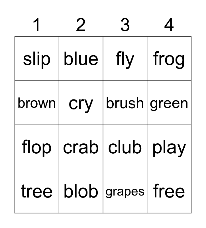 This bingo card has 16 words: blob, play, fly, slip, flop, blue, club, grapes, brown, cry, tree, frog, crab, green, brush and free.