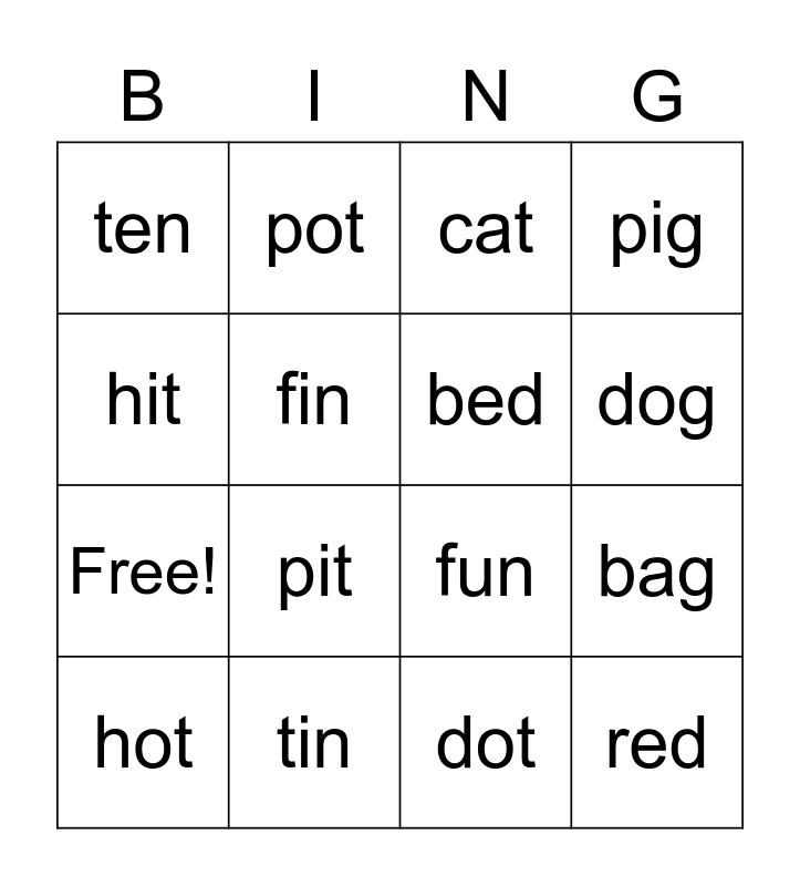This bingo card has 20 words: bag, bug, cat, cut, hot, hit, tin, ten, Free!, pot, pit, fun, fin, red, bed, log, dog, pig, dot and mat.