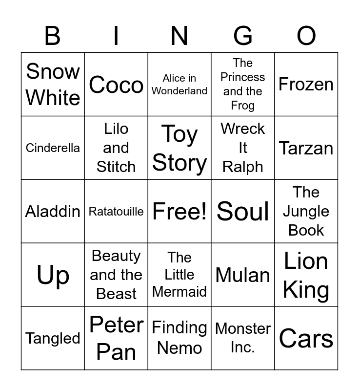 This bingo card has a free space and 25 words: Beauty and the Beast, Finding Nemo, Toy Story, Tangled, Frozen, Snow White, Cinderella, Coco, Soul, The Little Mermaid, Wreck It Ralph, Aladdin, Mulan, Lion King, Lilo and Stitch, Hercules, The Jungle Book, Alice in Wonderland, Tarzan, Ratatouille, Cars, Peter Pan, Up, The Princess and the Frog and Monster Inc..
