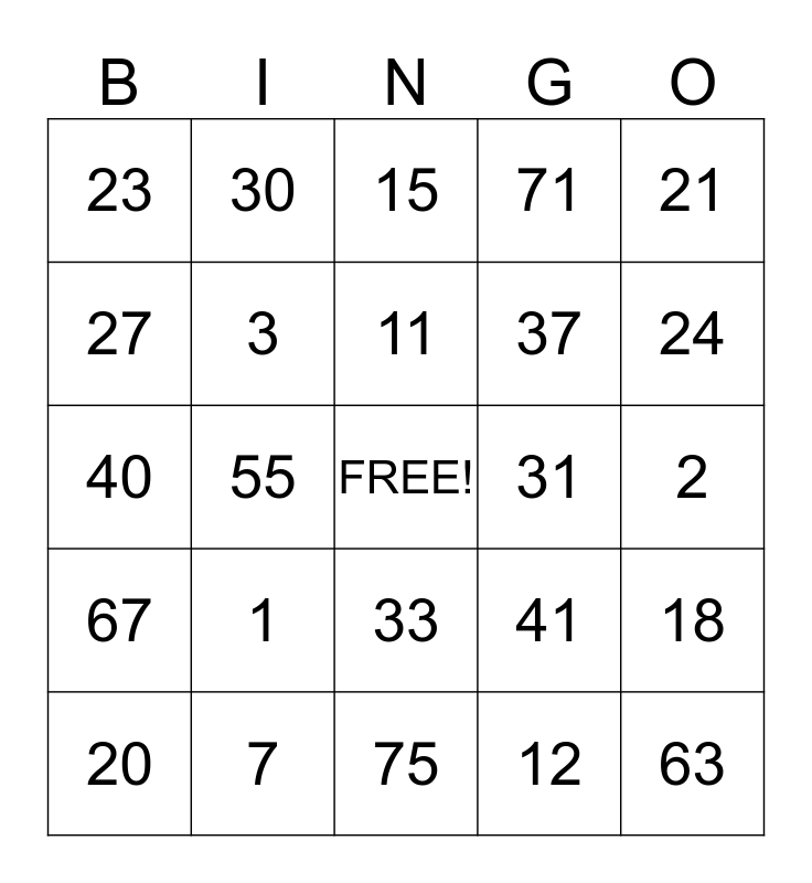 This bingo card has a free space and 24 words: 1, 7, 11, 20, 21, 23, 27, 30, 31, 33, 37, 40, 41, 18, 3, 12, 2, 15, 24, 55, 63, 67, 71 and 75.