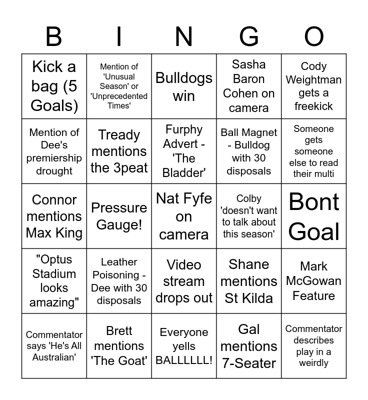 This bingo card has 65 words: Free!, Mention of Nathan Jones Retirement, Mention of Bulldogs coming from 5th, Mark McGowan Feature, Scomo Feature, Someone wearing a face mask, Mention of 'Unusual Season' or 'Unprecedented Times', Random ex-footballer brought out the woodwork for opinion/interview, Furphy Advert - 'The Bladder', Google Advert - 'What is a Blinder', Video stream drops out, Max Gawn Goal, Bont Goal, Cody Weightman gets a freekick, Mention of injured player not playing, Mention of Dee's premiership drought, Pressure Gauge!, Kick a bag (5 Goals), Jack Steele Medal (10 Tackles), Ball Magnet - Bulldog with 30 disposals, Leather Poisoning - Dee with 30 disposals, "Optus Stadium looks amazing", Sasha Baron Cohen on camera, Ben Cousins on Camera, Mention/Feature of Brownlow Winner, Dusty and Bailey Smith Comparison, Mention/Feature of Dusty, Nic Naitinui on camera, Nat Fyfe on camera, Chris Hemsworth feature, Commentator says 'He's All Australian', Mention of AFLW Winners, 2016 Grand Final, Mention of Alistair Clarkson Reitrement, Shane mentions St Kilda, Brett mentions 'The Goat', Somebody says 'The Spainos', Connor mentions Max King, Gal mentions 7-Seater, Reed gets into a bag of chips, Tready mentions the 3peat, Cam mentions Ollie Wines, Colby 'doesn't want to talk about this season', Someone mentions Finch's new hair, Any Eagles supporter mentions 2018, Score Review, Someone gets someone else to read their multi, Deliberate out of bounds, Commentator describes play in a weirdly, Blood Rule, Mention of Ticket Sales, Mention of the MCG, Some pub outside of Optus on camera, Everyone yells BALLLLLL!, Anyone mentions that Mzungu lives next door, Cross down to boundary commentator, Medi Sub activated, Bulldogs win, Demons win, Drawing at any stage after the 1st quarter, BT mentions ‘Candy’, Xavier Ellis on screen, Matthew Pavlich on screen, Someone refers to Easton Wood as ‘Tready’ and Commentator says ‘The Big Dance’.