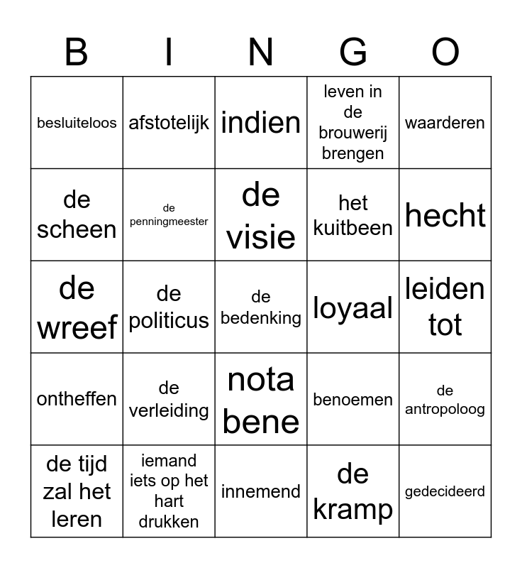 This bingo card has 36 words: de voorzitter, het bestuur, de secretaris, de penningmeester, benoemen, ontheffen, de visie, aangezien, waarderen, de sociale media, de politicus, leven in de brouwerij brengen, oprecht, loyaal, hecht, besluiteloos, gedecideerd, de verleiding, de bedenking, indien, leiden tot, de antropoloog, iemand iets op het hart drukken, de tijd zal het leren, innemend, afstotelijk, de wreef, de pees, het kuitbeen, de scheen, hoofdzakelijk, de charme, de kramp, nota bene, dat spreekt vanzelf and door de knieën gaan.