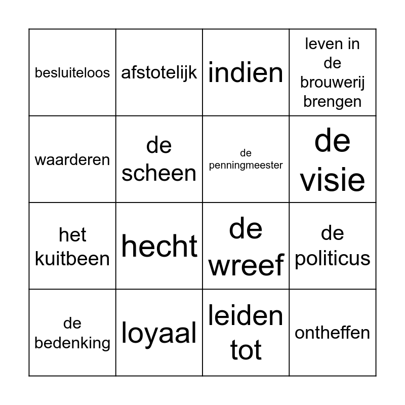 This bingo card has 36 words: de voorzitter, het bestuur, de secretaris, de penningmeester, benoemen, ontheffen, de visie, aangezien, waarderen, de sociale media, de politicus, leven in de brouwerij brengen, oprecht, loyaal, hecht, besluiteloos, gedecideerd, de verleiding, de bedenking, indien, leiden tot, de antropoloog, iemand iets op het hart drukken, de tijd zal het leren, innemend, afstotelijk, de wreef, de pees, het kuitbeen, de scheen, hoofdzakelijk, de charme, de kramp, nota bene, dat spreekt vanzelf and door de knieën gaan.