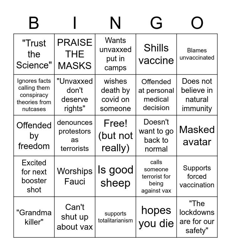This bingo card has a free space and 24 words: Worships Fauci, Can't shut up about vax, wishes death by covid on someone, "Grandma killer", Blames unvaccinated, "Trust the Science", Ignores facts calling them conspiracy theories from nutcases, PRAISE THE MASKS, Doesn't want to go back to normal, Is good sheep, Offended at personal medical decision, Offended by freedom, calls someone terrorist for being against vax, Supports forced vaccination, "Unvaxxed don't deserve rights", hopes you die, Masked avatar, Wants unvaxxed put in camps, Does not believe in natural immunity, denounces protestors as terrorists, "The lockdowns are for our safety", Excited for next booster shot, Shills vaccine and supports totalitarianism.
