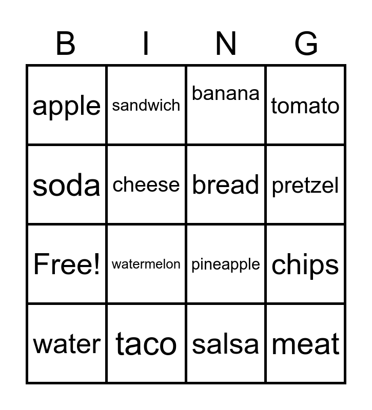 This bingo card has 20 words: chips, salad, banana, avocado, water, soda, taco, apple, Free!, sandwich, watermelon, pineapple, cheese, meat, bread, pizza, pretzel, tomato, salsa and guacamole.