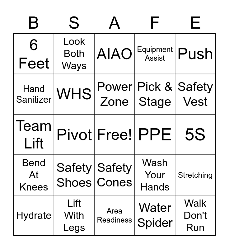This bingo card has a free space and 37 words: TDR, Stow, Seatbelts, WHS, Stretching, Safety Shoes, Power Zone, Social Distancing, Push, Gloves, Pivot, Equipment Assist, Walk Don't Run, 5S, Hand Sanitizer, Bend At Knees, Step Platform, AIAO, Safety Cones, PPE, 6 Feet, Safety Vest, Hydrate, Area Readiness, Induct, Water Spider, Look Both Ways, Standard Work, First Aid, Divert, Green Mile, Lift With Legs, Team Lift, Slow Down, Wash Your Hands, Pick & Stage and Eyes Up.