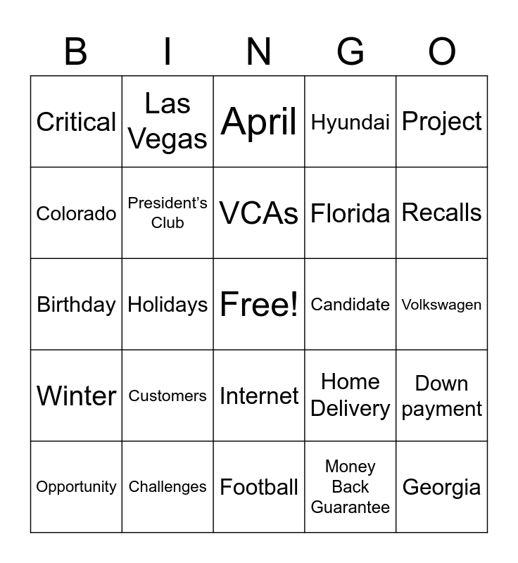 This bingo card has a free space and 24 words: Customers, Challenges, VCAs, Opportunity, Project, Critical, Colorado, Las Vegas, Candidate, Internet, Florida, Birthday, Home Delivery, Down payment, President’s Club, Money Back Guarantee, Volkswagen, April, Recalls, Holidays, Georgia, Winter, Hyundai and Football.