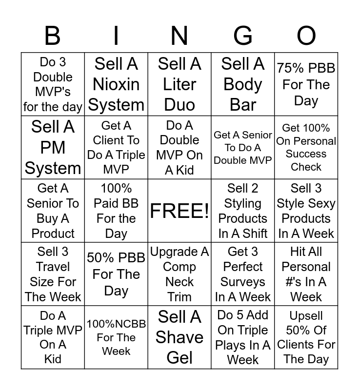This bingo card has a free space and 24 words: 50% PBB For The Day, 100%NCBB For The Week, Do A Double MVP On A Kid, Do A Triple MVP On A Kid, 75% PBB For The Day, Do 3 Double MVP's for the day, Sell A PM System, Sell A Nioxin System, Sell 2 Styling Products In A Shift, Upgrade A Comp Neck Trim, Get A Senior To Do A Double MVP, Get A Senior To Buy A Product, Get 3 Perfect Surveys In A Week, Hit All Personal #'s In A Week, Get A Client To Do A Triple MVP, Do 5 Add On Triple Plays In A Week, Sell 3 Style Sexy Products In A Week, Sell A Liter Duo, Get 100% On Personal Success Check, 100% Paid BB For the Day, Upsell 50% Of Clients For The Day, Sell 3 Travel Size For The Week, Sell A Body Bar and Sell A Shave Gel.