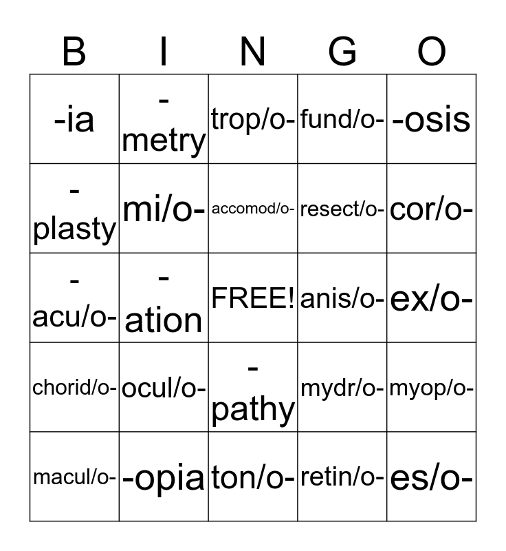 This bingo card has a free space and 36 words: lacrim/o-, scleral/o-, coren/o-, mi/o-, mydr/o-, chorid/o-, accomod/o-, -al, -osis, -iasis, -ation, fund/o-, fove/o-, anis/o-, cor/o-, -ia, intra-, ocul/o-, es/o-, trop/o-, ex/o-, myop/o-, -opia, macul/o-, ton/o-, -metry, -acu/o-, -ity, resect/o-, -plasty, phot/o-, phob/o-, retin/o-, -pathy, conunctiv/o- and -itis.