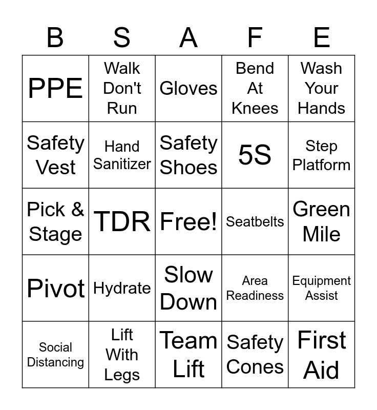 This bingo card has a free space and 32 words: Safety Cones, WHS, TDR, Divert, Pivot, Hand Sanitizer, Wash Your Hands, Equipment Assist, Walk Don't Run, AIAO, Safety Shoes, Gloves, Stretching, Stow, Seatbelts, Power Zone, Social Distancing, Pick & Stage, Slow Down, Hydrate, Area Readiness, 6 Feet Push, Green Mile, Lift With Legs, First Aid, Bend At Knees, 5S, Safety Vest, PPE, Team Lift, Eyes Up and Step Platform.