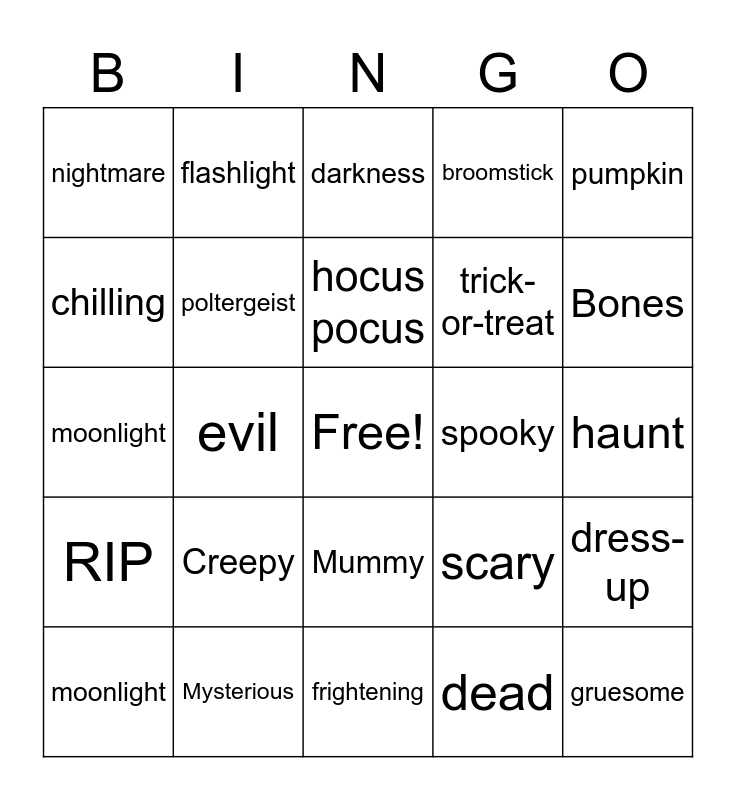 This bingo card has a free space and 55 words: dress up, moonlight, scary, nightmare, frightening, cobweb, poltergeist, ghost, trick-or-treat, cauldron, broomstick, haunted house, jack-o-lantern, Halloween, October 31st, tombstone, pumpkin, evil, eerie, gruesome, spooky, witch, scary, darkness, tombstone, hocus pocus, dead, devil, haunt, dress-up, candy, superstition, supernatural, cackle, chilling, moonlight, scream, RIP, vampire, costume, flashlight, Wicked, zombie, Ghastly, Creepy, Mysterious, Goblin, Paranormal, Poltergeist, Bones, Full moon, Raven, Witchcraft, Mummy and Grim reaper.