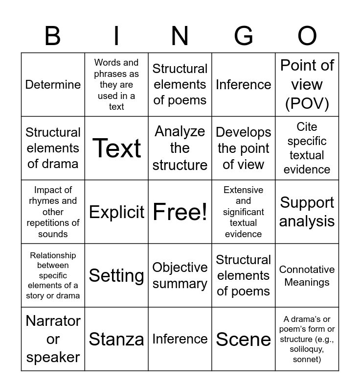This bingo card has a free space and 31 words: Inference, Perspective, Explicit, Evaluate, Determine, Structural elements of poems, Text, Structural elements of poems, Extensive and significant textual evidence, Scene, Support analysis, A drama’s or poem’s form or structure (e.g., soliloquy, sonnet), Drawing inferences, Tone, Cite specific textual evidence, Figurative meanings, Connotative Meanings, Setting, Relationship between specific elements of a story or drama, Objective summary, Point of view (POV), Determine central ideas, Narrator or speaker, Words and phrases as they are used in a text, Develops the point of view, Structural elements of drama, Inference, Impact of rhymes and other repetitions of sounds, Stanza, Analyze the structure and Impact of rhymes and other repetitions of sounds.