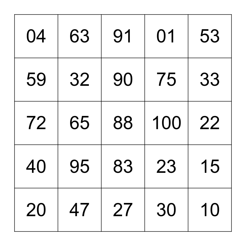 This bingo card has a free space and 24 words: 95, 47, 90, 20, 53, 04, 59, 63, 100, 83, 75, 72, 23, 15, 32, 30, 22, 91, 33, 65, 10, 40, 01 and 27.