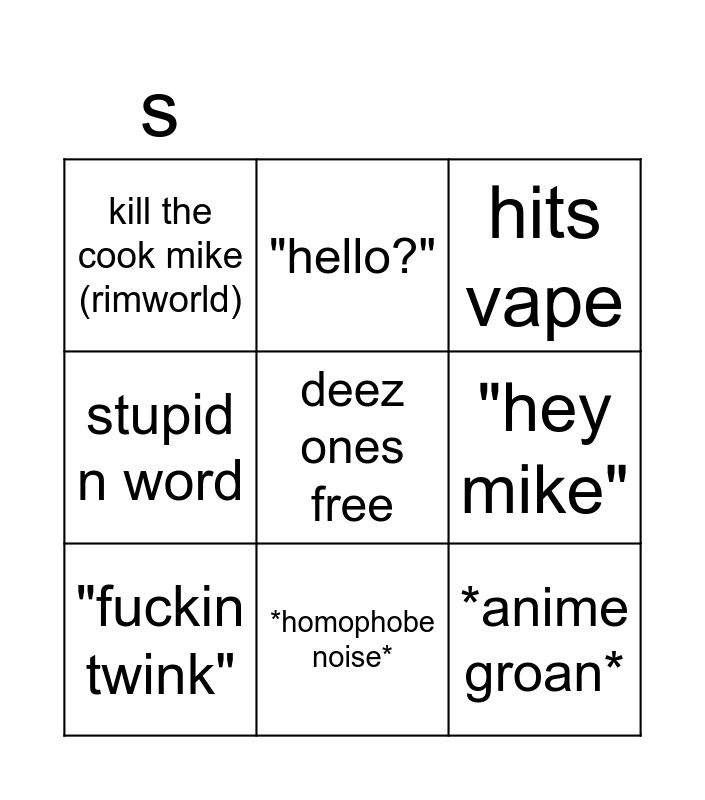 This bingo card has a free space and 16 words: deez, gets mad at mike, hits vape, kill the cook mike (rimworld), hey one of you should stream, "hello?", n word joke, gets unnecessarily annoyed by something irrelevant, *anime groan*, "hey mike", agabruh, stupid n word, gets mad, *homophobe noise*, "fuckin twink" and say the n word pontus.