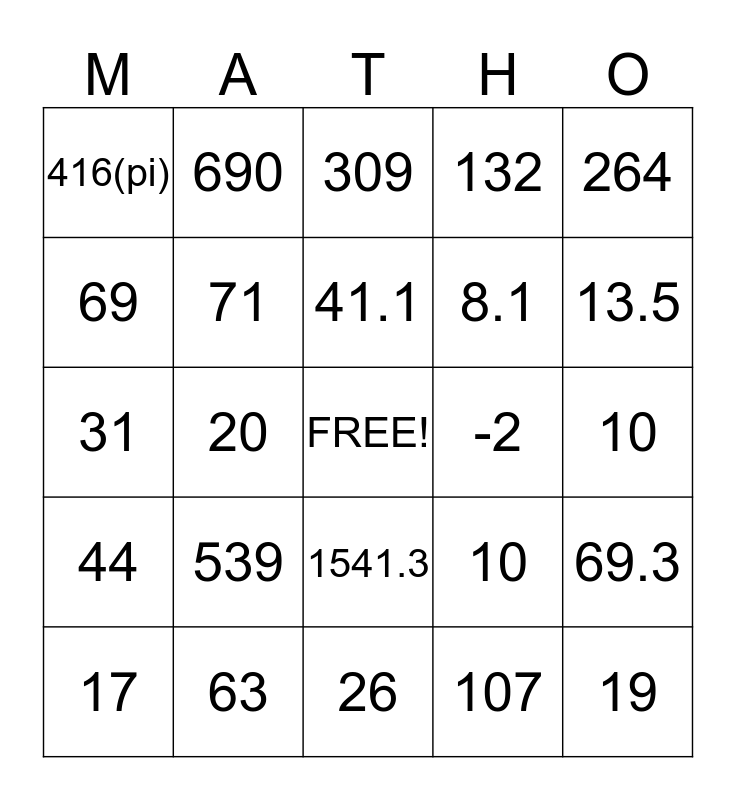 This bingo card has a free space and 24 words: 539, 63, 41.1, 17, 264, 416(pi), 69, 690, -2, 1541.3, 8.1, 31, 10, 69.3, 71, 107, 10, 309, 13.5, 20, 19, 44, 132 and 26.