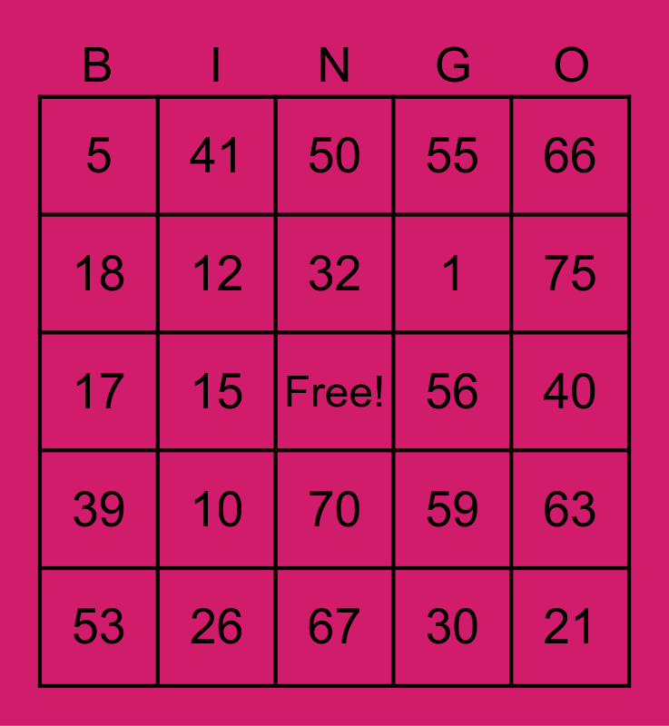 This bingo card has a free space and 24 words: 10, 26, 32, 53, 66, 5, 18, 41, 56, 70, 1, 17, 59, 63, 12, 30, 40, 50, 75, 15, 21, 39, 55 and 67.