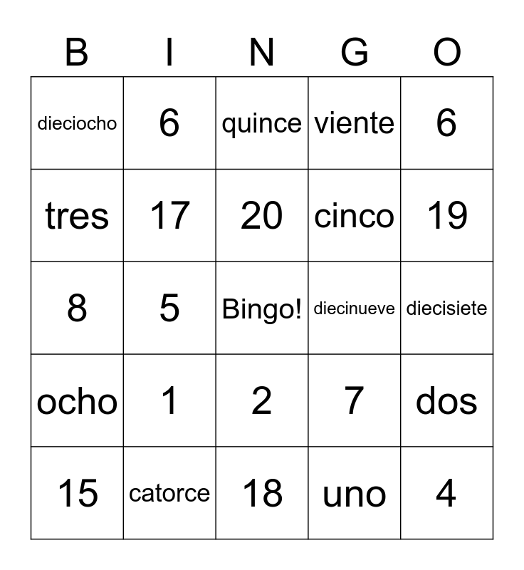 This bingo card has a free space and 24 words: 1, catorce, 20, 15, 6, dieciocho, tres, 6, diecinueve, 2, cinco, 8, 7, dos, 17, uno, diecisiete, quince, 19, 5, 4, ocho, viente and 18.