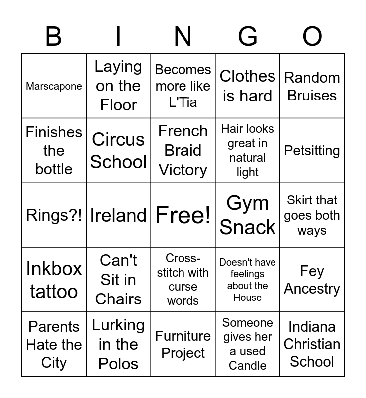 This bingo card has a free space and 24 words: Can't Sit in Chairs, Lurking in the Polos, French Braid Victory, Parents Hate the City, Random Bruises, Marscapone, Finishes the bottle, Laying on the Floor, Gym Snack, Cross-stitch with curse words, Hair looks great in natural light, Rings?!, Doesn't have feelings about the House, Fey Ancestry, Circus School, Someone gives her a used Candle, Skirt that goes both ways, Becomes more like L'Tia, Petsitting, Ireland, Indiana Christian School, Inkbox tattoo, Clothes is hard and Furniture Project.
