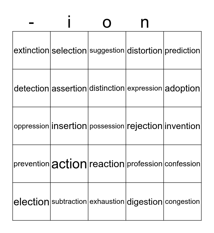 This bingo card has a free space and 24 words: action, subtraction, distinction, election, prediction, extinction, detection, selection, rejection, reaction, expression, oppression, profession, confession, assertion, digestion, invention, suggestion, adoption, insertion, congestion, prevention, distortion and exhaustion.