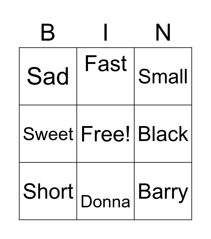 This bingo card has a free space and 8 words: Black, Small, Fast, Short, Sad, Barry, Sweet and Donna.