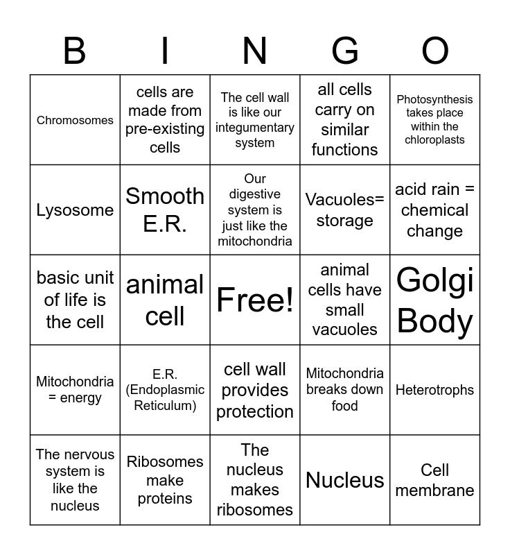 This bingo card has a free space and 24 words: E.R. (Endoplasmic Reticulum), Ribosomes make proteins, Our digestive system is just like the mitochondria, The nervous system is like the nucleus, Photosynthesis takes place within the chloroplasts, Chromosomes, Lysosome, cells are made from pre-existing cells, animal cells have small vacuoles, cell wall provides protection, Vacuoles= storage, basic unit of life is the cell, Mitochondria breaks down food, Heterotrophs, Smooth E.R., Nucleus, Golgi Body, The cell wall is like our integumentary system, acid rain = chemical change, animal cell, Cell membrane, Mitochondria = energy, all cells carry on similar functions and The nucleus makes ribosomes.