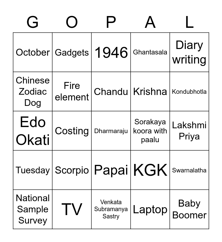 This bingo card has 76 words: Free!, 75, 1946, 29th, 7.55 pm, Alistair MacLean, Appaiah Sastry, Asst Superintendent, Avakaya, B.Com, Baby Boomer, Cameras, Chandu, Chinese Zodiac Dog, Cooking, Costing, Crafting, Dharmaraju, Diamond, Diary writing, Dictionary, Edo Okati, Fire element, Gadgets, Ghantasala, Gopala, Head of the Family, Hyderabad, Investigator, Jantar Mantar, K S Sarma, Kakinada, Kani, KGK, Kondubhotla, Krishna, Krupamma, Kurnool, Lakshmi Priya, Laptop, Life path 5, Marigold, Maths, Mobile phones, Mohd Rafi, Narasaraopet, National Sample Survey, October, On the rocks, Opal, Organizing, Papai, Pedda, Pens, Perry Mason, Pesara pachadi, Playing cards, Raghav, Ramana, Readers' Digest, Scorpio, Seenaiah Pantulu School, Seetharavamma, Serials, Shaving, Shreya, Sorakaya koora with paalu, SS&N college, Story telling, Sudhamshu, Swarnalatha, Tuesday, TV, Uma, Venkata Subramanya Sastry and Vizag.