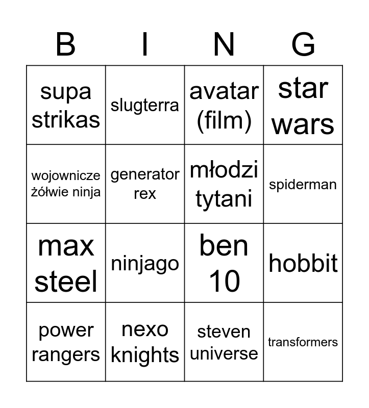 This bingo card has 16 words: nexo knights, hobbit, avatar (film), supa strikas, max steel, slugterra, ben 10, steven universe, wojownicze żółwie ninja, generator rex, power rangers, star wars, ninjago, spiderman, młodzi tytani and transformers.
