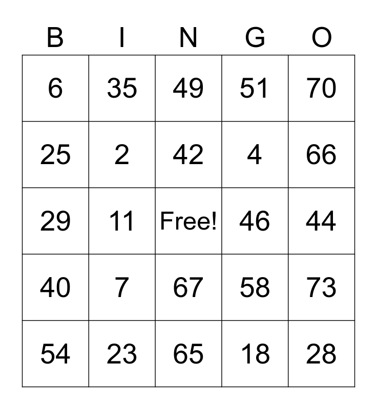 This bingo card has a free space and 24 words: 7, 23, 42, 54, 70, 6, 25, 35, 46, 67, 4, 29, 58, 73, 2, 18, 44, 49, 66, 11, 28, 40, 51 and 65.