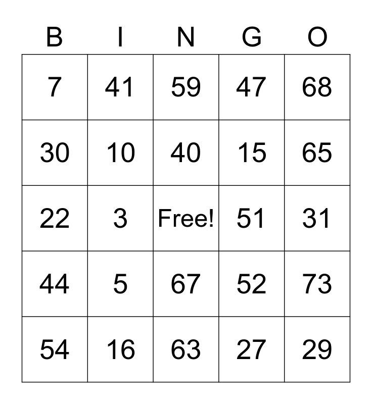 This bingo card has a free space and 24 words: 5, 16, 40, 54, 68, 7, 30, 41, 51, 67, 15, 22, 52, 73, 10, 27, 31, 59, 65, 3, 29, 44, 47 and 63.