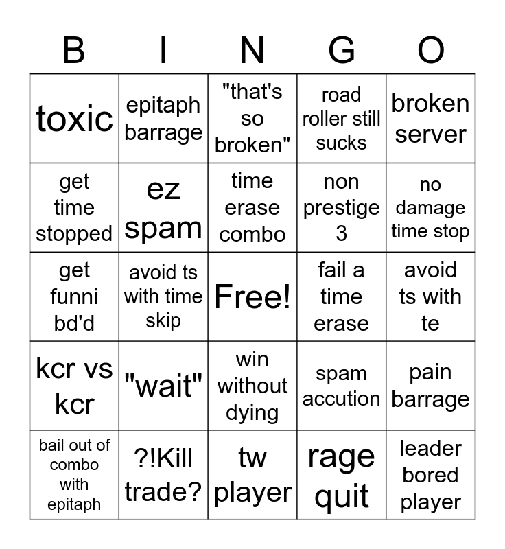 This bingo card has a free space and 24 words: "wait", ?!Kill trade?, time erase combo, bail out of combo with epitaph, broken server, toxic, get time stopped, epitaph barrage, fail a time erase, win without dying, non prestige 3, get funni bd'd, spam accution, pain barrage, ez spam, rage quit, avoid ts with te, "that's so broken", no damage time stop, avoid ts with time skip, leader bored player, kcr vs kcr, road roller still sucks and tw player.