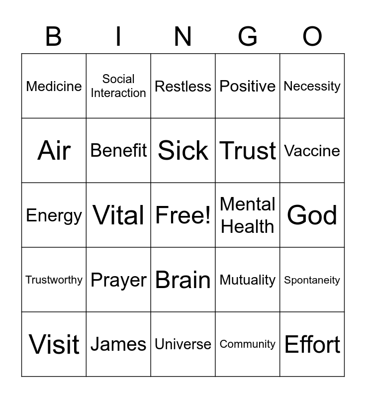 This bingo card has a free space and 24 words: Prayer, James, Sick, Visit, Necessity, Medicine, Air, Social Interaction, Mental Health, Brain, Trust, Energy, Mutuality, Spontaneity, Benefit, Community, God, Restless, Vaccine, Vital, Effort, Trustworthy, Positive and Universe.