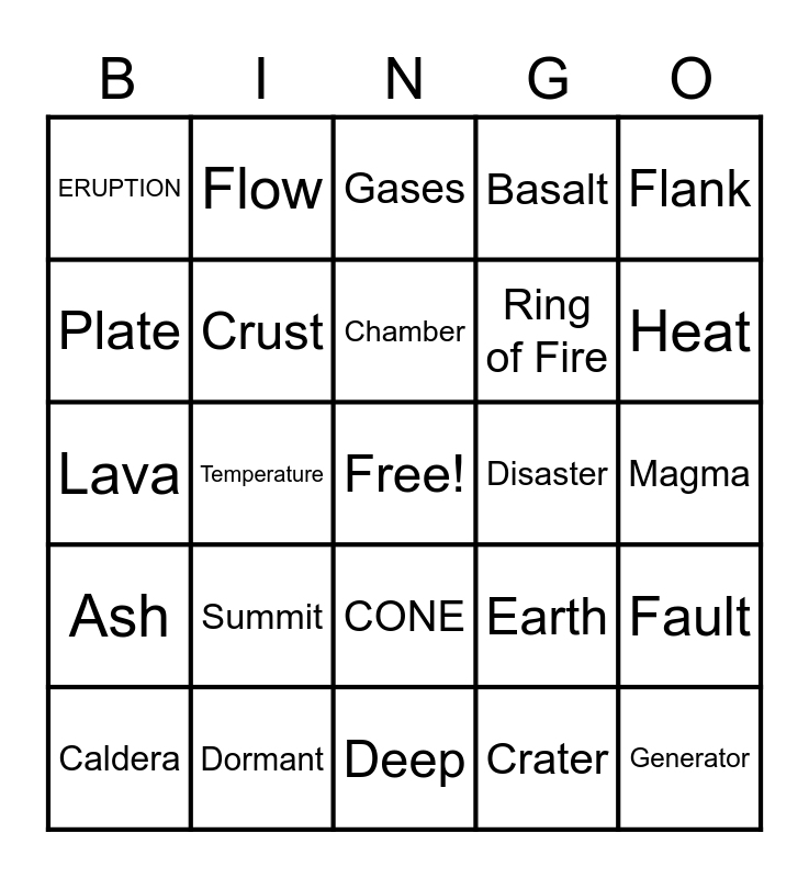 This bingo card has a free space and 34 words: Active, Crater, Extinct, Mountain, Ash, Crust, Flank, Caldera, Flow, Pressure, Chamber, Gases, Rock, Cloud, Disaster, Heat, Dormant, Lava, Summit, Earth, CONE, CORE, ERUPTION, Magma, Deep, Generator, Basalt, Mantle, Ring of Fire, Plate, hot spot, Temperature, Fault and Dust.