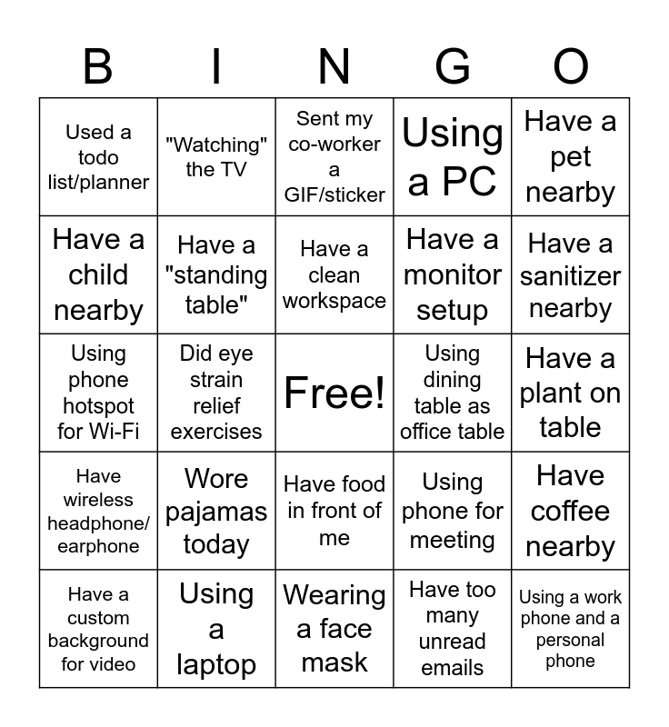 This bingo card has a free space and 24 words: Wore pajamas today, Using a laptop, Have a clean workspace, Have a custom background for video, Have a pet nearby, Used a todo list/planner, Have a child nearby, "Watching" the TV, Using dining table as office table, Have food in front of me, Have a monitor setup, Using phone hotspot for Wi-Fi, Using phone for meeting, Have coffee nearby, Have a "standing table", Have too many unread emails, Have a plant on table, Sent my co-worker a GIF/sticker, Have a sanitizer nearby, Did eye strain relief exercises, Using a work phone and a personal phone, Have wireless headphone/ earphone, Using a PC and Wearing a face mask.