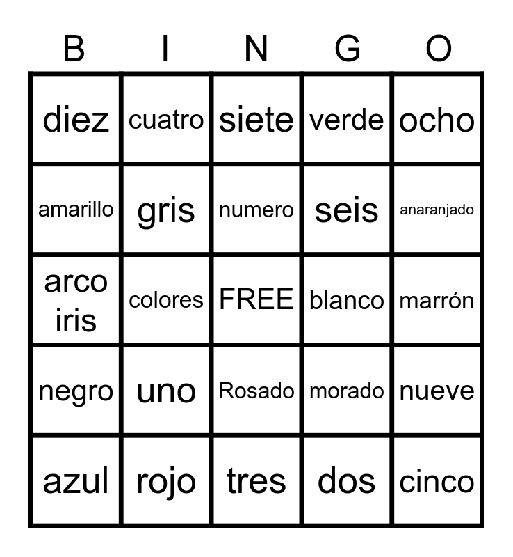 This bingo card has a free space and 24 words: uno, rojo, numero, azul, ocho, diez, amarillo, cuatro, blanco, Rosado, seis, arco iris, morado, nueve, gris, dos, marrón, siete, anaranjado, colores, cinco, negro, verde and tres.