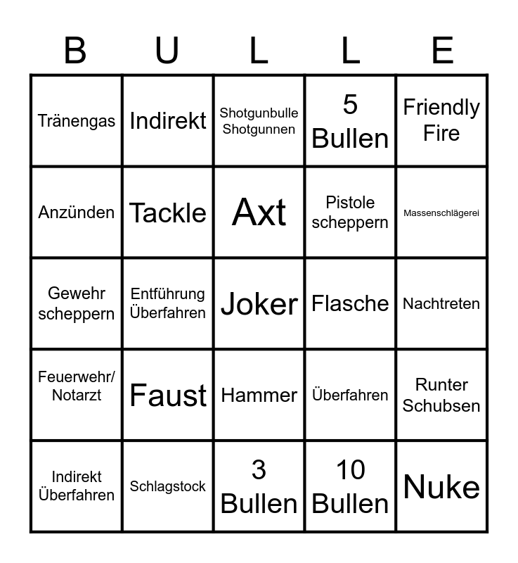 This bingo card has a free space and 24 words: Faust, Schlagstock, Axt, Indirekt Überfahren, Friendly Fire, Tränengas, Anzünden, Indirekt, Flasche, Hammer, Pistole scheppern, Gewehr scheppern, Überfahren, Runter Schubsen, Tackle, 10 Bullen, Nachtreten, Shotgunbulle Shotgunnen, Massenschlägerei, Entführung Überfahren, Nuke, Feuerwehr/ Notarzt, 5 Bullen and 3 Bullen.