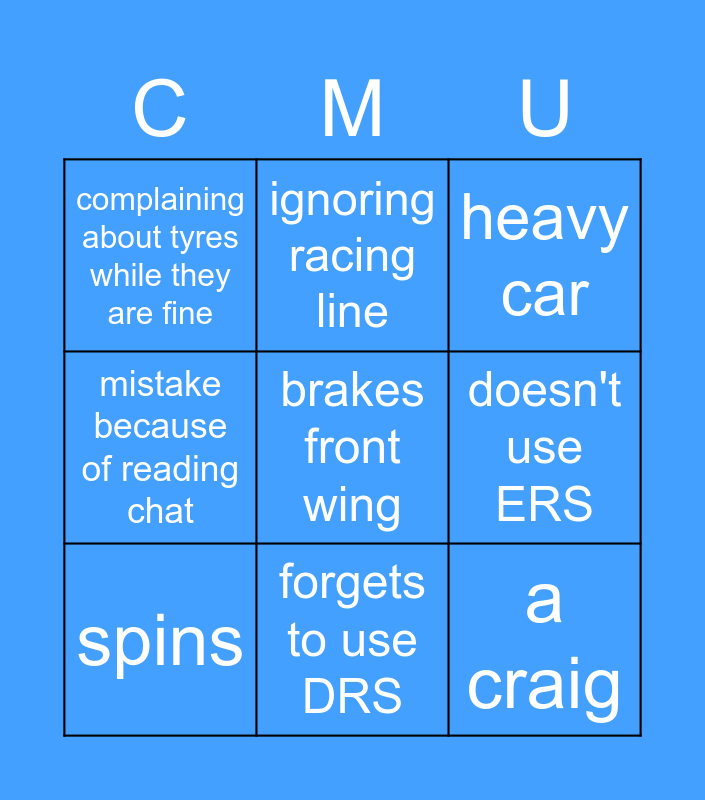 This bingo card has 9 words: spins, heavy car, ignoring racing line, mistake because of reading chat, complaining about tyres while they are fine, doesn't use ERS, brakes front wing, a craig and forgets to use DRS.