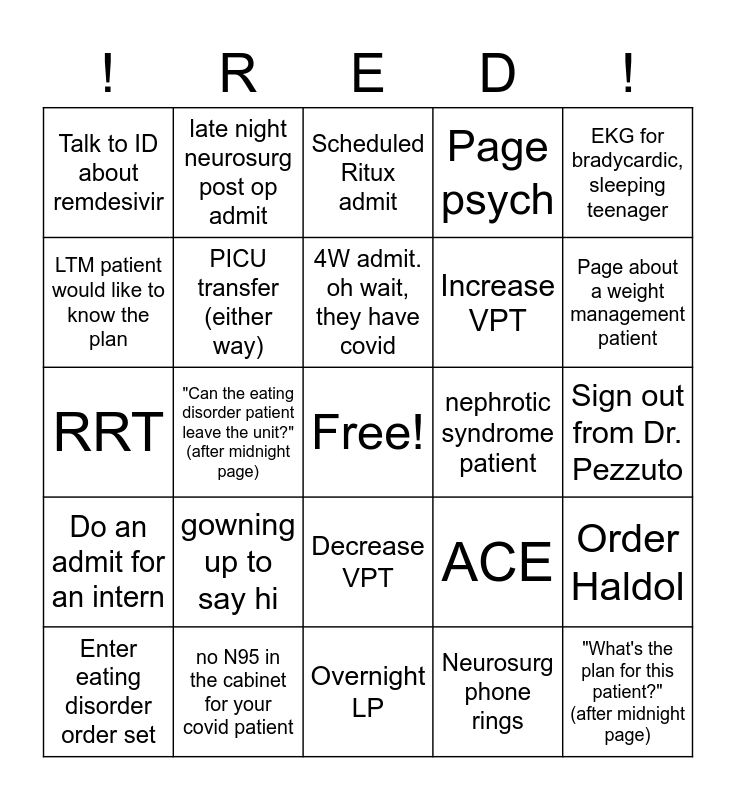 This bingo card has a free space and 24 words: gowning up to say hi, no N95 in the cabinet for your covid patient, 4W admit. oh wait, they have covid, Enter eating disorder order set, EKG for bradycardic, sleeping teenager, Talk to ID about remdesivir, LTM patient would like to know the plan, late night neurosurg post op admit, nephrotic syndrome patient, Decrease VPT, Increase VPT, RRT, ACE, Order Haldol, PICU transfer (either way), Neurosurg phone rings, Sign out from Dr. Pezzuto, Scheduled Ritux admit, Page about a weight management patient, "Can the eating disorder patient leave the unit?"(after midnight page), "What's the plan for this patient?" (after midnight page), Do an admit for an intern, Page psych and Overnight LP.