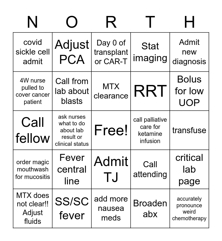 This bingo card has a free space and 24 words: Fever central line, SS/SC fever, MTX clearance, MTX does not clear!! Adjust fluids, Admit new diagnosis, covid sickle cell admit, 4W nurse pulled to cover cancer patient, Adjust PCA, call palliative care for ketamine infusion, Admit TJ, RRT, Call fellow, Call attending, critical lab page, Call from lab about blasts, Broaden abx, transfuse, Day 0 of transplant or CAR-T, Bolus for low UOP, ask nurses what to do about lab result or clinical status, accurately pronounce weird chemotherapy, order magic mouthwash for mucositis, Stat imaging and add more nausea meds.