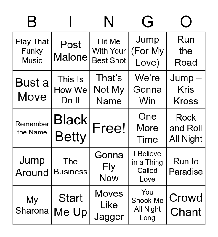This bingo card has a free space and 47 words: NFL Monday Night Football Theme, Crowd Chant, We Are the Champions, Moves Like Jagger, The Business, Roses, Post Malone, Life is a Highway, Bust a Move, Cotton Eye Joe, This Is How We Do It, Jump (For My Love), Run to Paradise, I Believe in a Thing Called Love, Right Round, Good Feeling, That’s Not My Name, One More Time, La Grange, Run the Road, Black Betty, You Shook Me All Night Long, Play That Funky Music, We’re Gonna Win, I Like to Move It, Jump – Kris Kross, My Sharona, Song 2, Gonna Fly Now, Jump Around, All I Do Is Win, My Songs Know What You Did in the Dark, Legend, The Final Countdown, Jump – Van Halen, Start Me Up, Rock and Roll All Night, Yeah!, Uptown Funk, Na Na Hey Hey Kiss Him Goodbye, Don’t Stop Believin’, Hit Me With Your Best Shot, Remember the Name, Hey Ya!, All of the Lights, Get Ready and Rock You Like a Hurricane.