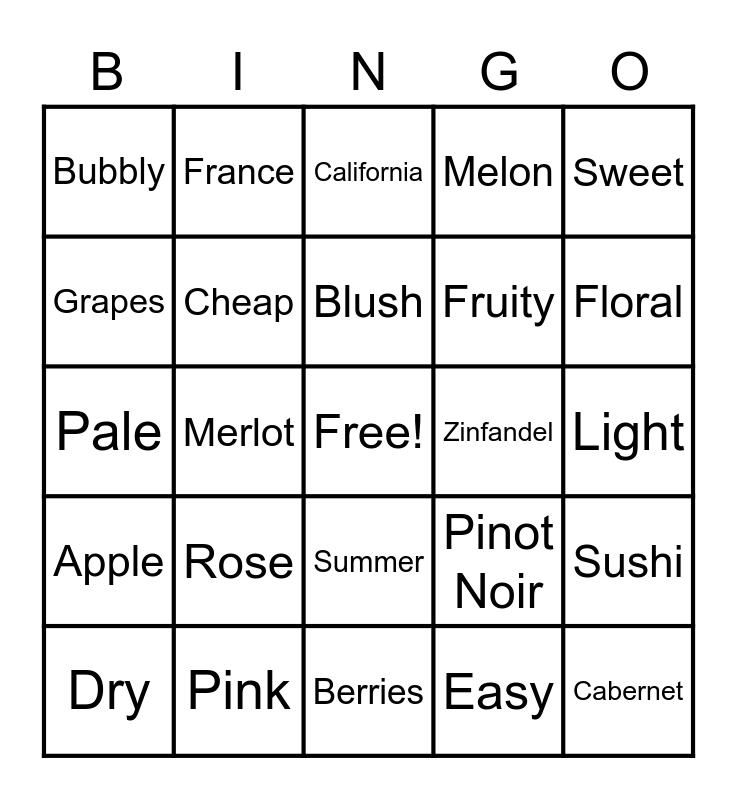 This bingo card has a free space and 24 words: Rose, Pink, Blush, Dry, Sweet, Bubbly, Grapes, France, Zinfandel, Summer, Fruity, Pale, Pinot Noir, Sushi, Cheap, Easy, Light, California, Floral, Merlot, Cabernet, Apple, Melon and Berries.
