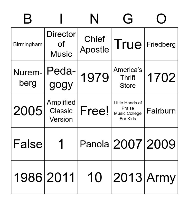 This bingo card has a free space and 24 words: 1, 2011, 1979, 1986, Friedberg, Birmingham, Nurem-berg, Director of Music, Little Hands of Praise Music College For Kids, Panola, America’s Thrift Store, 2005, 2007, 2009, Peda-gogy, 2013, Fairburn, Chief Apostle, 1702, Amplified Classic Version, Army, False, True and 10.
