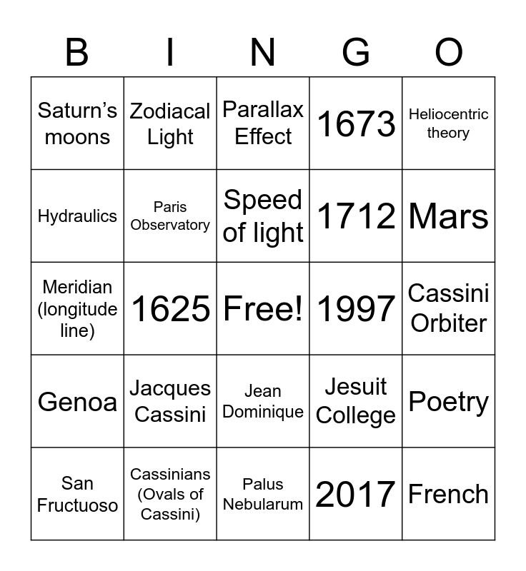 This bingo card has a free space and 35 words: Astrology, Panzano Observatory, Louis XIV, Paris Observatory, Jean Dominique, 1673, Hydraulics, Flood control, Speed of light, Jupiter, Meridian (longitude line), Heliocentric theory, Copernicus, Astronomer, Saturn’s moons, 1997, 2017, 1625, Genoa, French, Jesuit College, San Fructuoso, Poetry, Cassinians (Ovals of Cassini), Parallax Effect, Mars, Jean Richer, Galileo, 1712, Cassini Orbiter, Craters, Palus Nebularum, Jacques Cassini, Zodiacal Light and Telescopes.