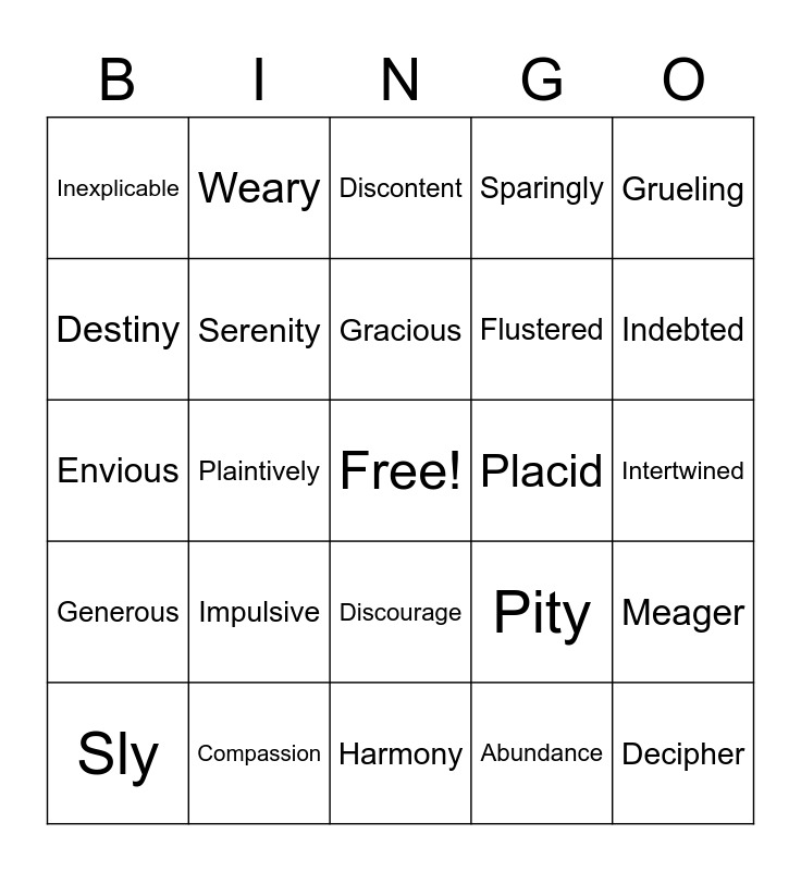 This bingo card has a free space and 24 words: Impulsive, Compassion, Gracious, Sly, Grueling, Inexplicable, Destiny, Weary, Placid, Discourage, Flustered, Envious, Pity, Meager, Serenity, Abundance, Intertwined, Discontent, Indebted, Plaintively, Decipher, Generous, Sparingly and Harmony.