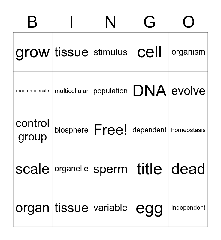 This bingo card has 1 images, a free space and 35 words: binary fission, unicellular, multicellular, title, scale, population, community, organism, biome, biosphere, cell, adapt, dependent, evolve, grow, develop, organelle, independent, stimulus, homeostasis, dead, tissue, organ, variable, tissue, control group, constants, DNA, macromolecule, asexual, gamete, egg, sperm, ATP and obtain and use energy.