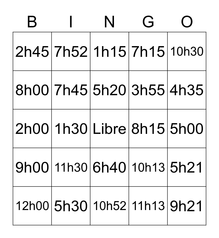 This bingo card has a free space and 29 words: 12h00, 6h45, 1h30, 4h15, 2h45, 1h15, 7h45, 11h30, 8h15, 5h30, 5h00, 9h21, 10h52, 11h13, 4h35, 3h05, 6h40, 9h00, 10h30, 2h00, 10h13, 11h00, 3h55, 8h00, 7h15, 7h52, 5h21, 5h20 and 5h55.