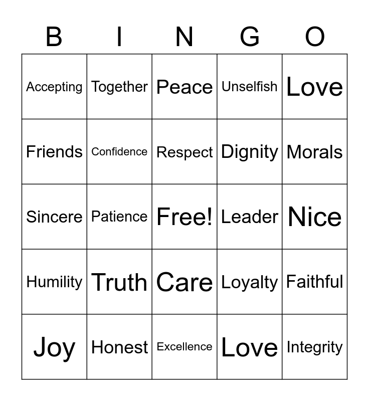 This bingo card has a free space and 24 words: Truth, Honest, Respect, Joy, Love, Accepting, Friends, Together, Leader, Care, Dignity, Sincere, Loyalty, Faithful, Confidence, Love, Nice, Peace, Morals, Patience, Integrity, Humility, Unselfish and Excellence.