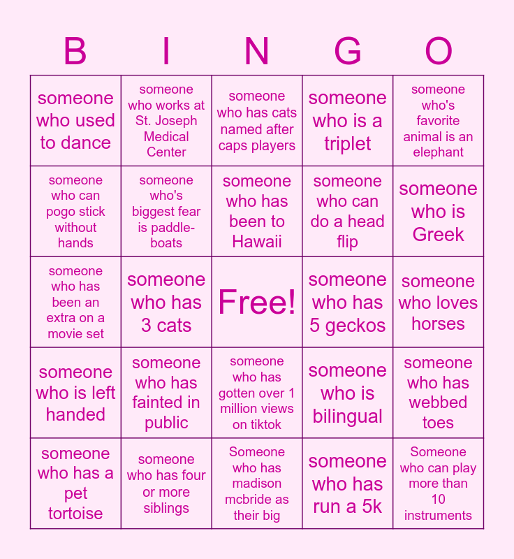 This bingo card has a free space and 24 words: someone who has fainted in public, someone who has four or more siblings, someone who has been to Hawaii, someone who has a pet tortoise, someone who's favorite animal is an elephant, someone who used to dance, someone who can pogo stick without hands, someone who works at St. Joseph Medical Center, someone who has 5 geckos, someone who has gotten over 1 million views on tiktok, someone who can do a head flip, someone who has been an extra on a movie set, someone who is bilingual, someone who has webbed toes, someone who's biggest fear is paddle-boats, someone who has run a 5k, someone who loves horses, someone who has cats named after caps players, someone who is Greek, someone who has 3 cats, Someone who can play more than 10 instruments, someone who is left handed, someone who is a triplet and Someone who has madison mcbride as their big.