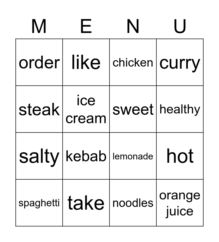 This bingo card has 20 words: hot, spicy, chicken, salad, spaghetti, steak, take, order, salty, like, kebab, lemonade, ice cream, orange juice, sweet, sour, healthy, curry, noodles and any.