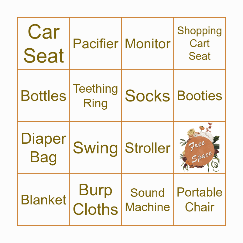 This bingo card has 1 images and 19 words: Bathtub, Monitor, Bassinet, Blanket, Bottles, Burp Cloths, Car Seat, Diaper Bag, Pacifier, Swing, Stroller, Teething Ring, Portable Chair, Socks, Bib, Booties, Shopping Cart Seat, Sound Machine and Play Mat.