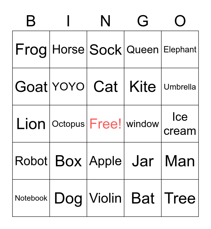 This bingo card has a free space and 26 words: Apple, Bat, Cat, Dog, Elephant, Frog, Goat, Horse, Ice cream, Jar, Kite, Lion, Man, Notebook, Octopus, Pirate, Queen, Robot, Sock, Tree, Umbrella, Violin, window, Box, YOYO and ZEBRA.